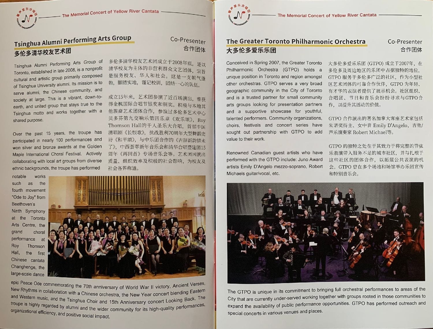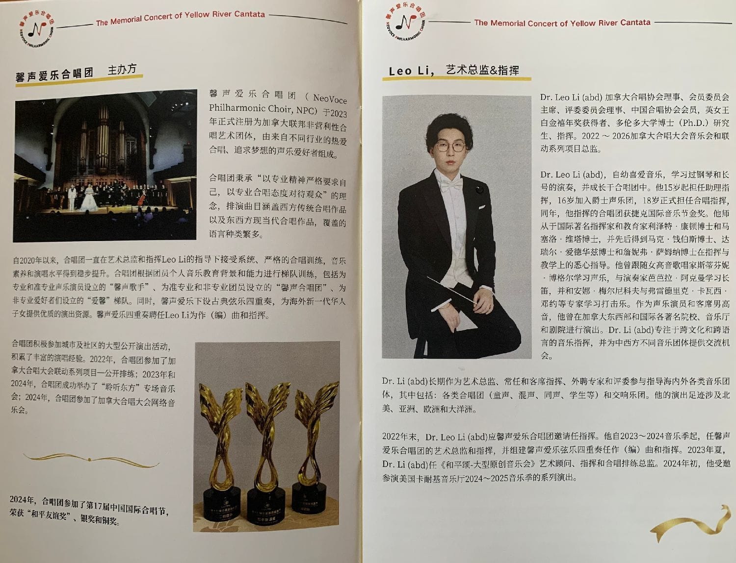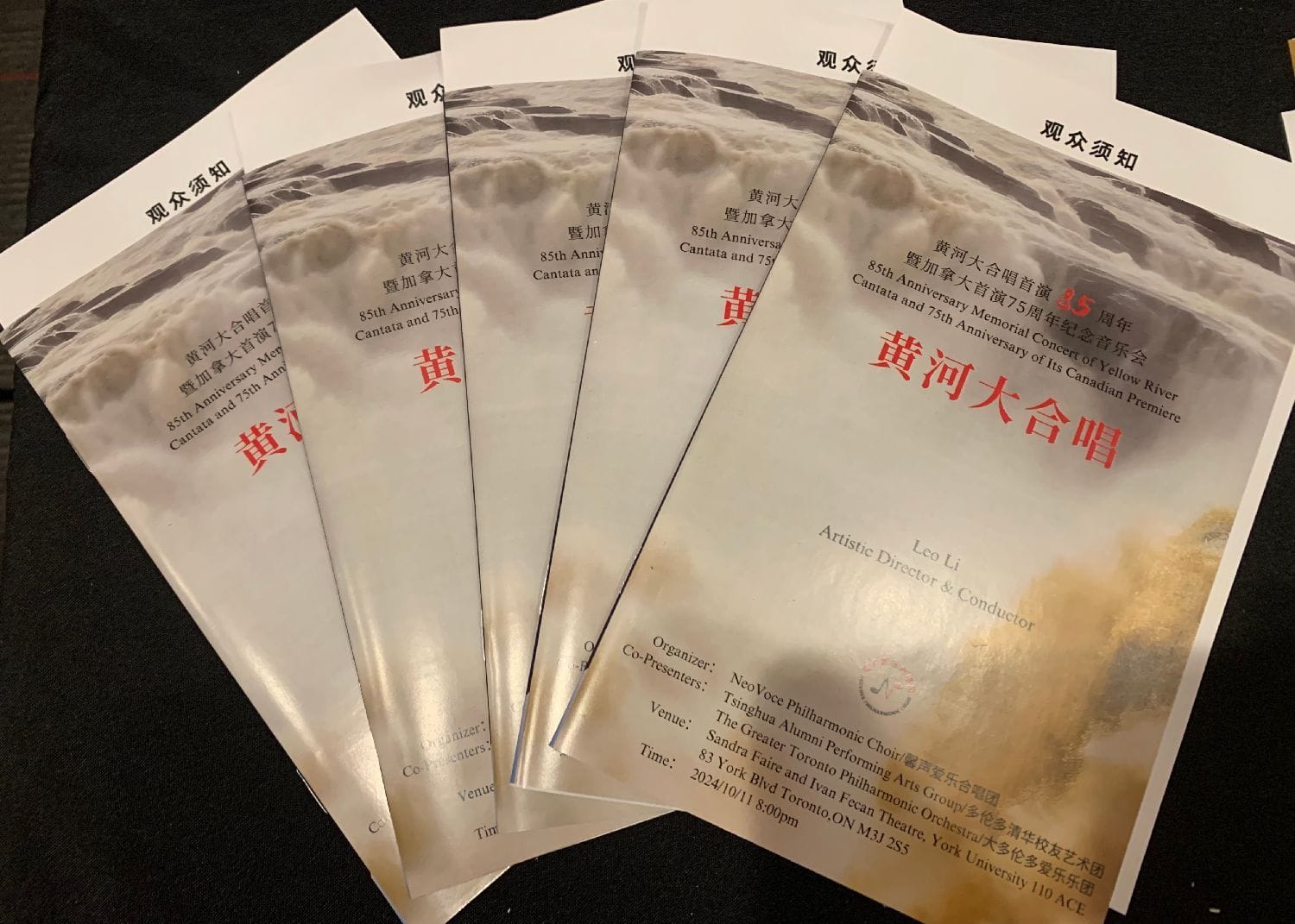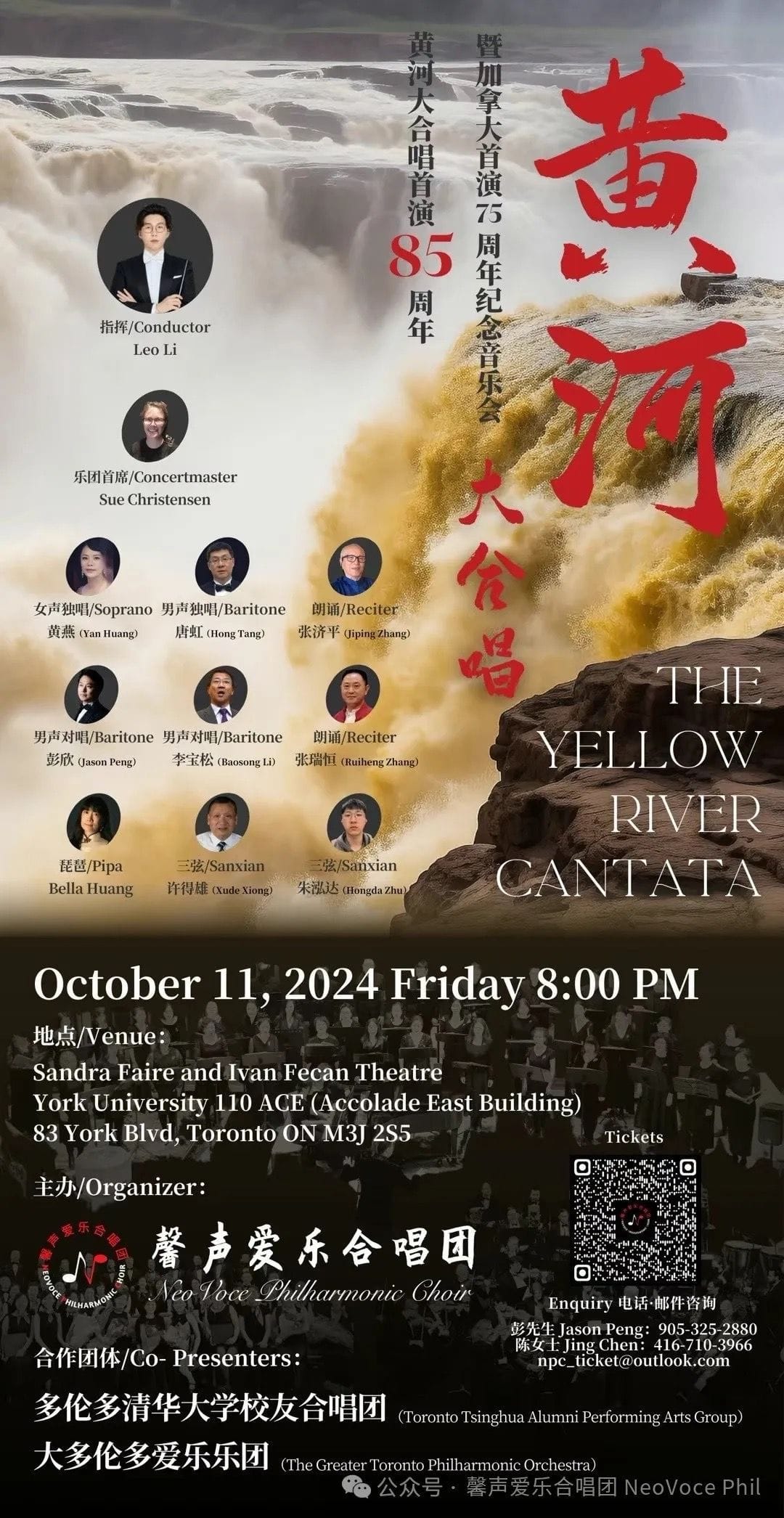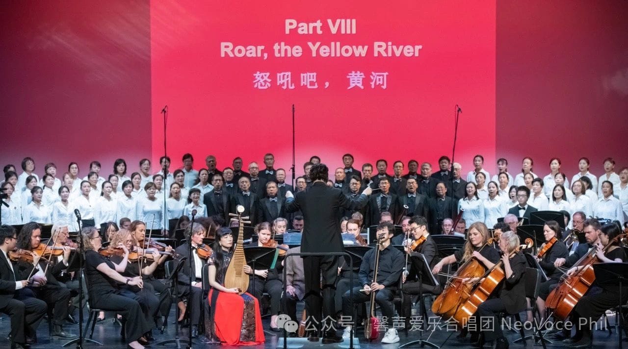 2024年10月11日(周五)晚,在多伦多约克大学剧院(Sandra Faire and Ivan Fecan Theatre,York University 110ACE, 83 York Blvd. Toronto),由加拿大合唱协会理事与会员委员会主席、馨声爱乐合唱团艺术总监兼指挥 Leo Li 执棒,馨声爱乐合唱团(NeoVoce Philharmonic Choir)携手多伦多清华校友艺术团合唱团 (Tsinghua Alumni Performing Arts Group) 与大多伦多爱乐乐团 (The Greater Toronto Philharmonic Orchestra) 联袂出演的全本《黄河大合唱》音乐会,受到全场观众热烈欢迎和高度赞誉,获得震撼性成功。