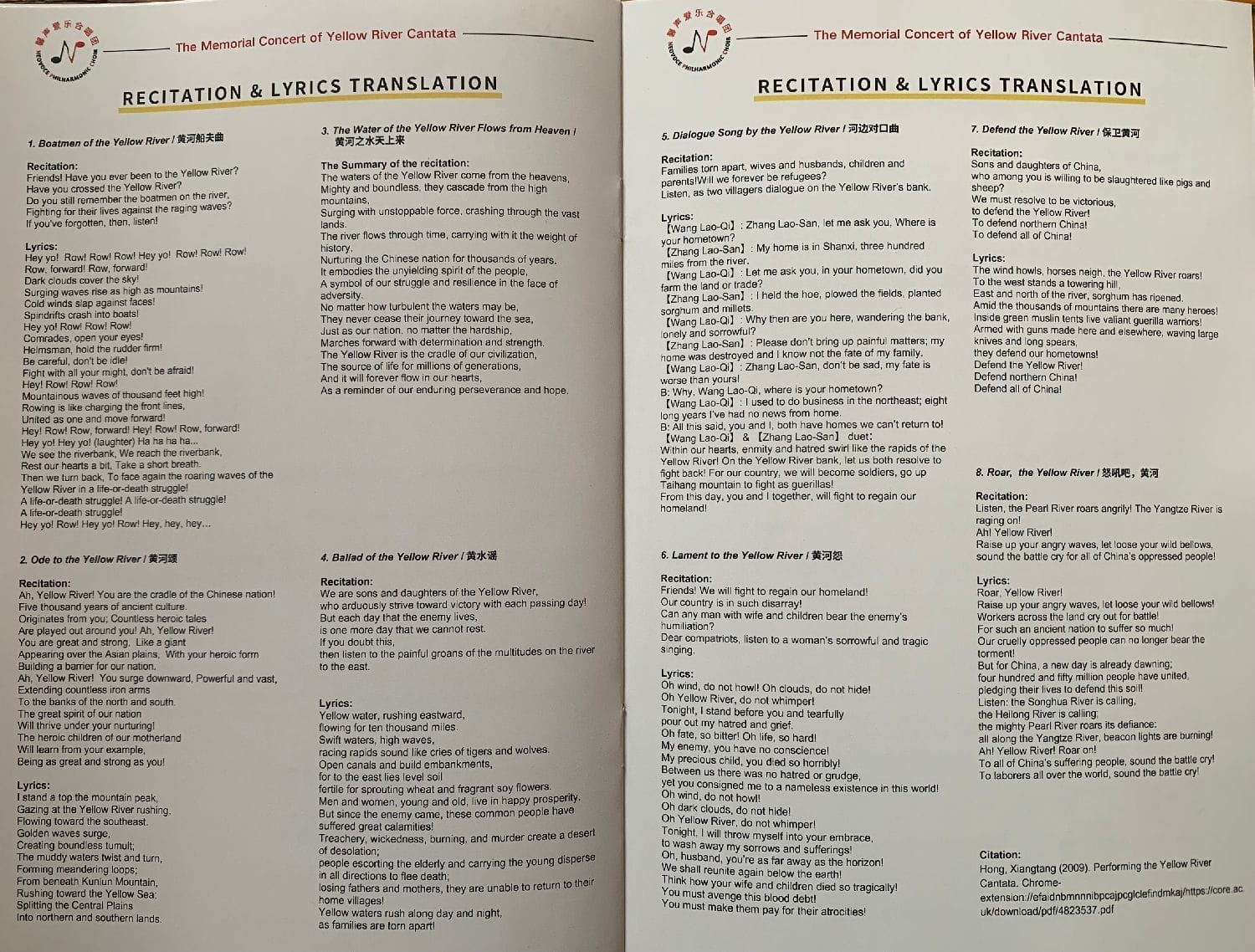 我是一个情绪比较内敛的人,但今天身临异域听华声,又是经典国粹大放送,难免不被触及到心底最柔软的地方。我几度被柔美曼妙的音乐所感染,如第一乐章《黄河船夫曲》中“我们看见了河岸”到“气哪,喘一喘”这段的柔板;第二乐章《黄河颂》的背景音乐;第三乐章《黄河之水天上来》的激情配乐朗诵中的诗句“红日高照,水上金光迸裂。月出东山,河面银光似雪”;第四乐章《黄水谣》从开头的“黄水奔流向东方”到“男女老少喜洋洋”这段音乐非常的柔美抒情;第六乐章《黄河怨》中的背景音乐和过门曲调非常的凄美哀婉,令人垂泪;第八乐章《怒吼吧,黄河》中“五千年的民族,苦难真不少”到“扬子江上燃遍了抗日的烽火”这段先抑后扬的合唱等等,都是能叫我此处情深泪沾巾的触点。