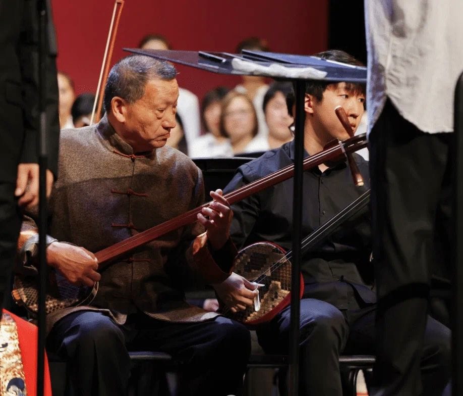 第五乐章《河边对口曲》:经典对唱乐章,通过男中音彭欣与李宝松对唱,表达了百姓生活的艰难、对侵略者的愤怒以及保家卫国的决心。民乐三弦的弹奏(许德雄、朱泓达)更为这一乐章增添了浓厚的民族特点。