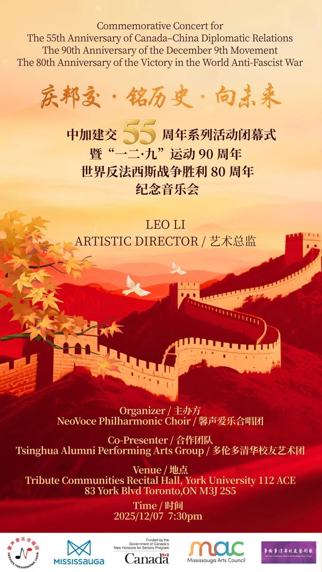 2025年12月7日,《庆邦交 · 铭历史 · 向未来——中加建交55周年系列活动闭幕式暨“一二·九”运动90周年、世界反法西斯战争胜利80周年纪念音乐会》一场跨越历史的音乐盛典,即将隆重开启。