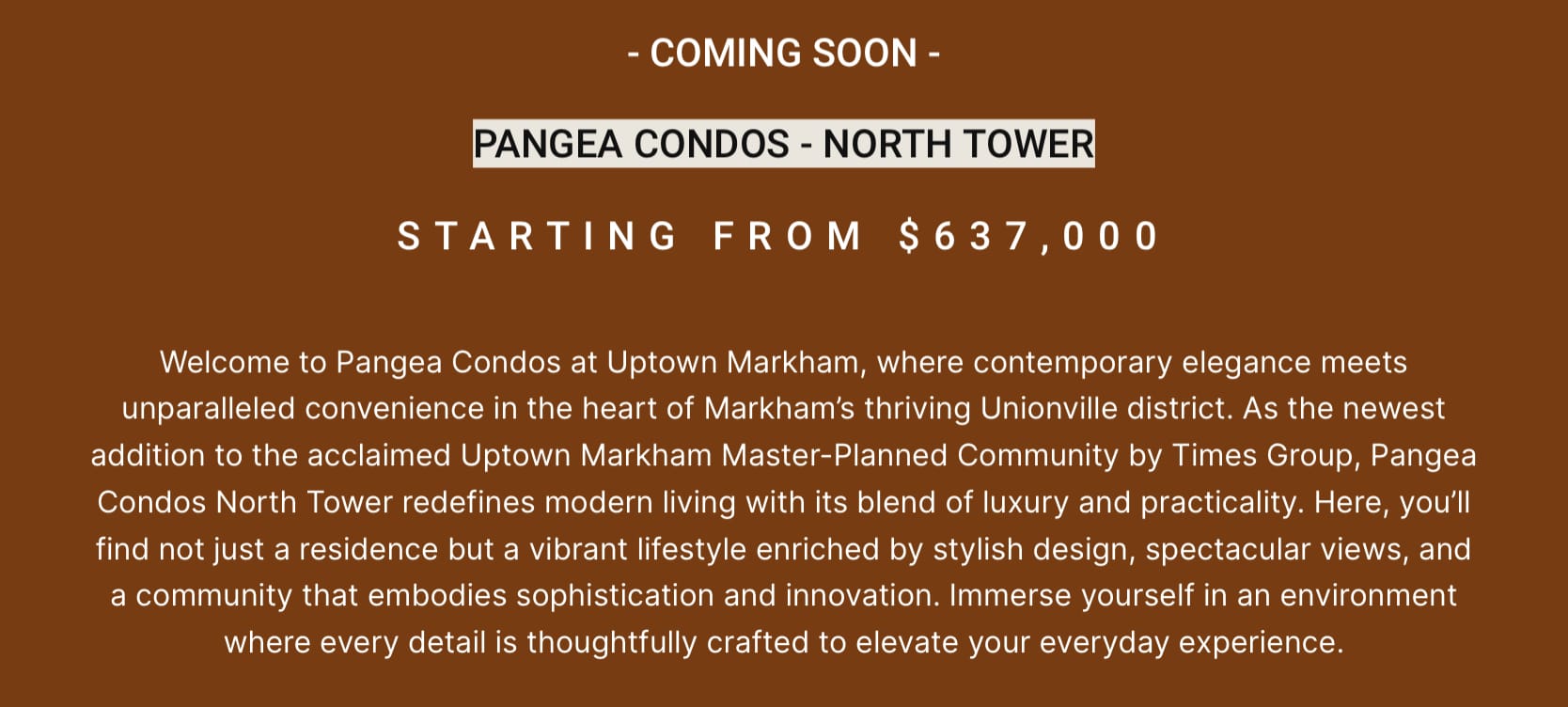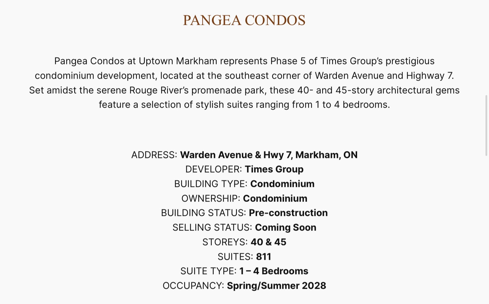 Pangea, the exciting new condominium community by Times Group in the heart of Uptown Markham, immerses you in nature, convenience, and fun.